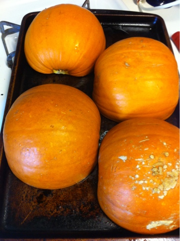 I made the purée by cutting the pumpkins in half and scraping out the seeds. They were placed cut side down on a greased baking sheet and baked for about 30 minutes at 400º. Once cool enough to handle, I scooped out the flesh and puréed in a food processor. This was much easier than peeling and cubing the pumpkin before it was cooked, like I did with the cheese pumpkin.